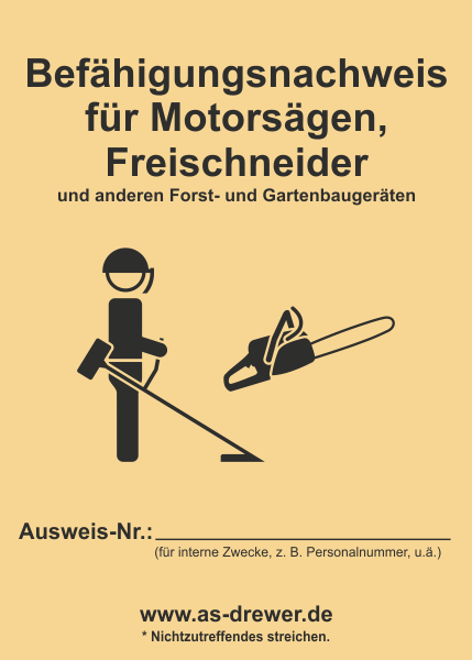 Auch bekannt als Fachausweis, Befähigungsnachweis, Ausbildungsschein, Motorsägenführerschein, Motorsägenschein, Kettensägenschein, Brennholzschein, Holzschein, Fällschein, Selbstwerberschein usw.