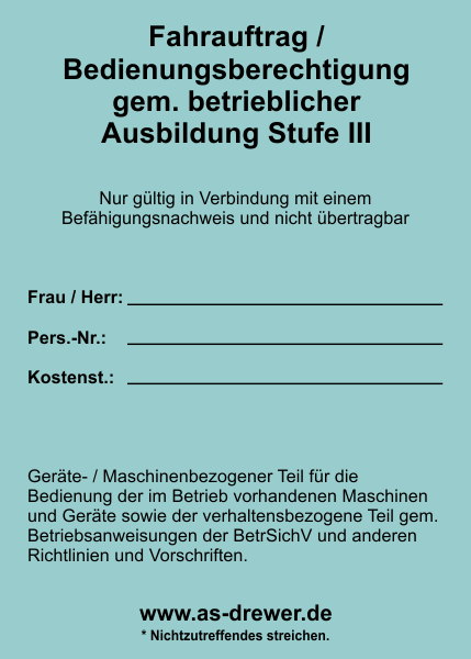 Die Beauftragung zum Führen - Fahren - Steuern - Bedienen - der aufgeführten Maschinen und Fahrzeuge ist durch die Ausstellung von schriftlichen Beauftragungen für das Fahr- und Steuerpersonal in Betrieben durch den Unternehmer oder Sicherheitsbeauftragten somit auch rechtlich geregelt, da gem. den Berufgenossenschaften Grundsätzen (BGG / DGUV-G) nur ein/e ausgebildet/e - geschulte/r und beauftragte/r Mitarbeiter/in derartige Arbeitsmaschinen bzw. Geräte führen - fahren - steuern oder bedienen darf.